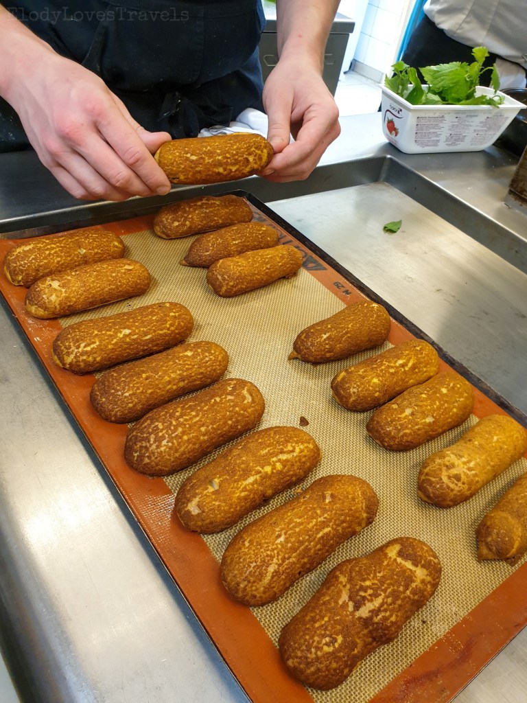 Nous avons ainsi, participer, avec le pâtissier de la cuisine, à la conception du dessert, des éclairs craquelin au perlatgonium rozat, crémeux mangue, sorbet passion.