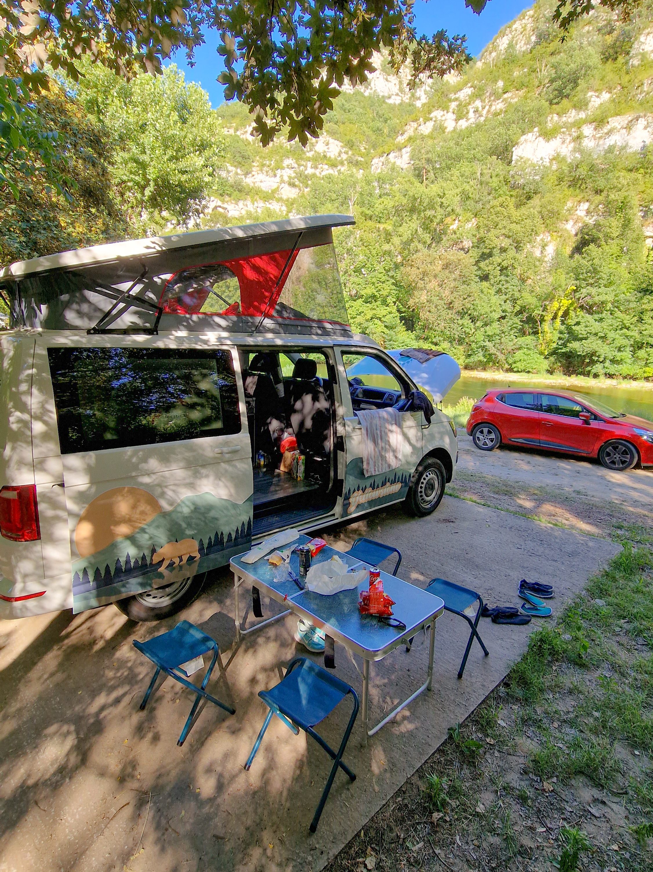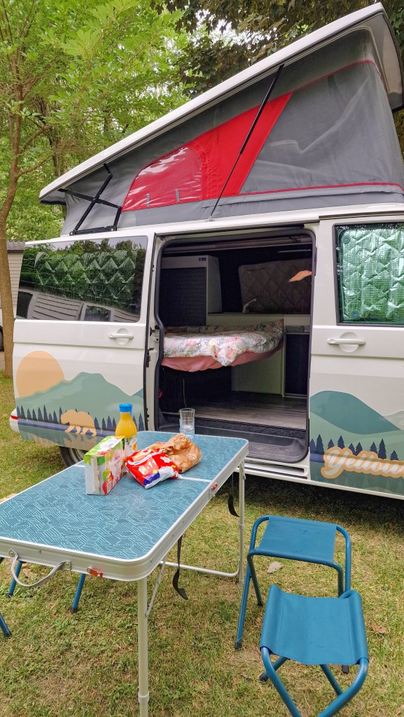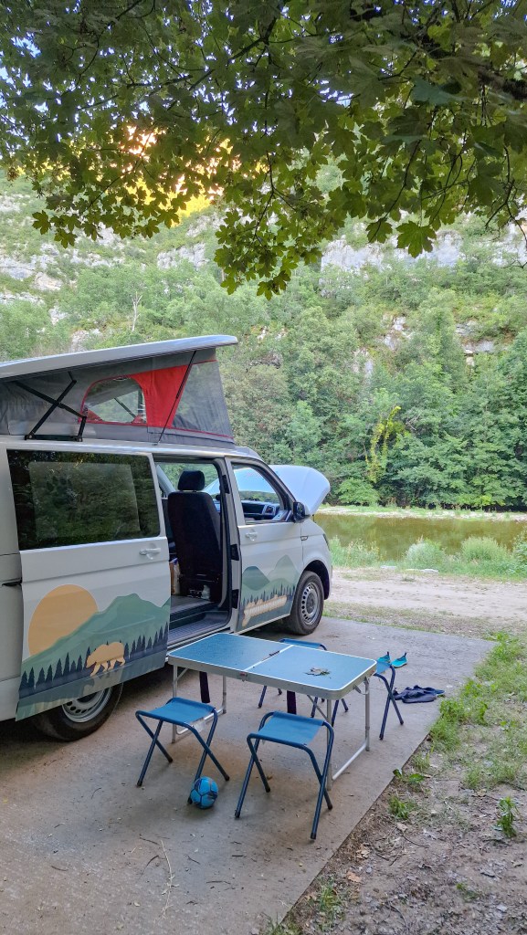 Nous avons dormi comme des loirs 😄 Aucun bruit dans le camping à part celui de l’eau tout près du van. Une telle détente !!