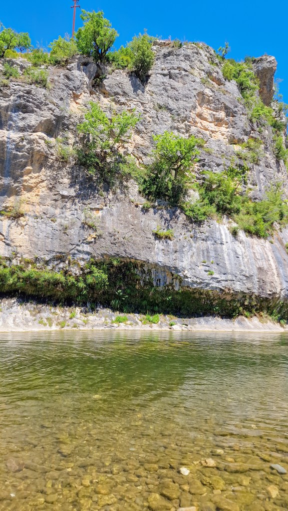 Après avoir fait le plein de bons produits 😋 nous avons pris la direction de Castelbouc pour un pique nique rafraichissant sur une plage de galets au pieds du petite hameau atypique.