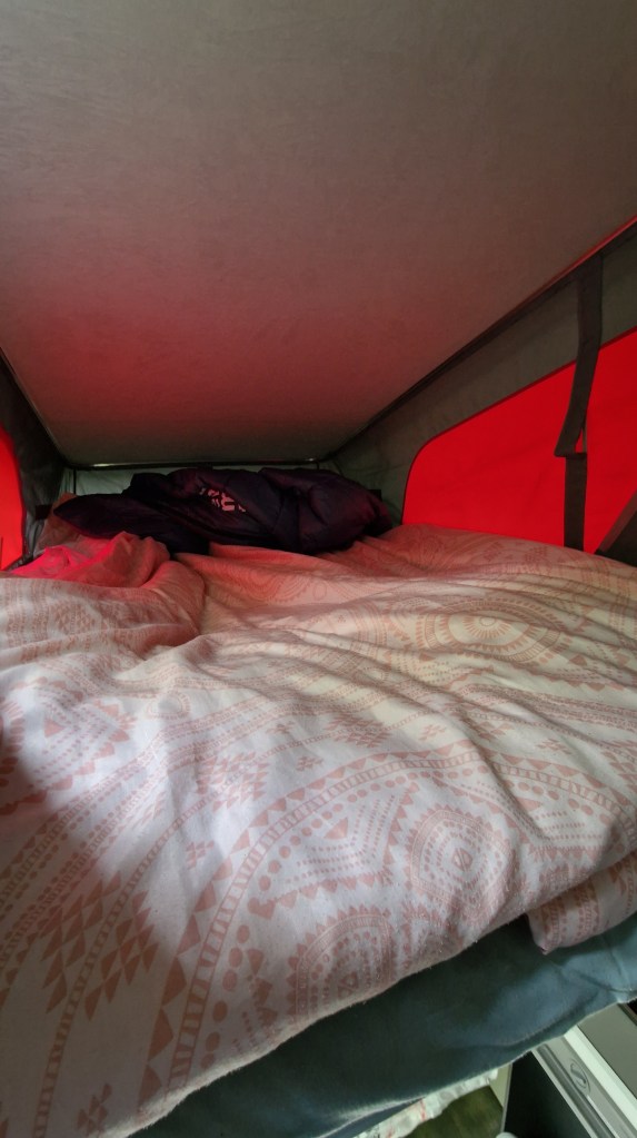 La banquette arrière se transforme en couchage 2 places et le toi s’ouvre pour offrir, là encore, un couchage 2 places. Et nous installions les toilettes chimiques à l’intérieur en cas de besoins nocturnes 😊