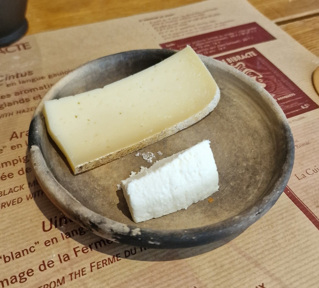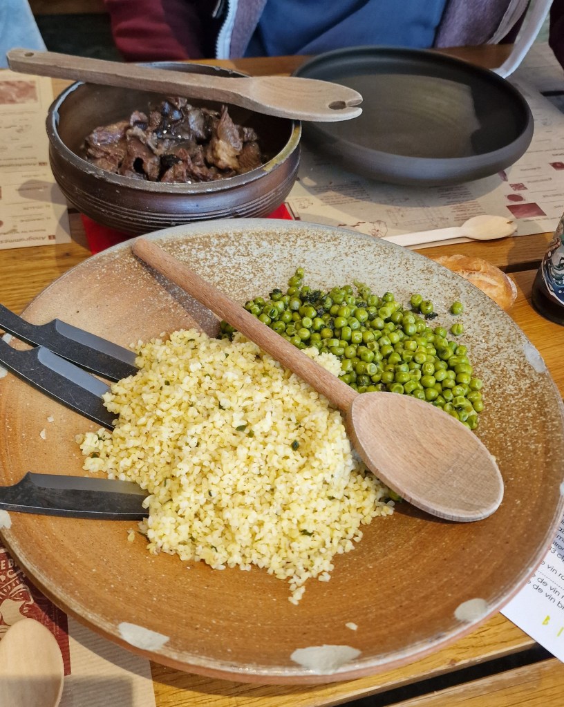 Salade de lentilles à l’ail des ours, boeuf sauce champignons, céréales et petits pois, fromages et galette aux pommes. Le tout, préparé à base de produits locaux, biologiques, de saison et servis dans une vaisselle d’époque. Dernier point fort : la quantité !! Le repas est vraiment très copieux 😋