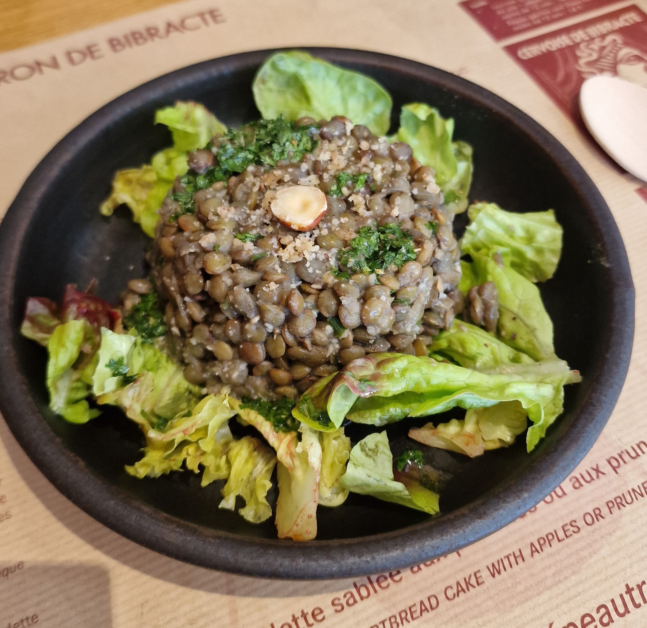 Salade de lentilles à l’ail des ours, boeuf sauce champignons, céréales et petits pois, fromages et galette aux pommes. Le tout, préparé à base de produits locaux, biologiques, de saison et servis dans une vaisselle d’époque. Dernier point fort : la quantité !! Le repas est vraiment très copieux 😋