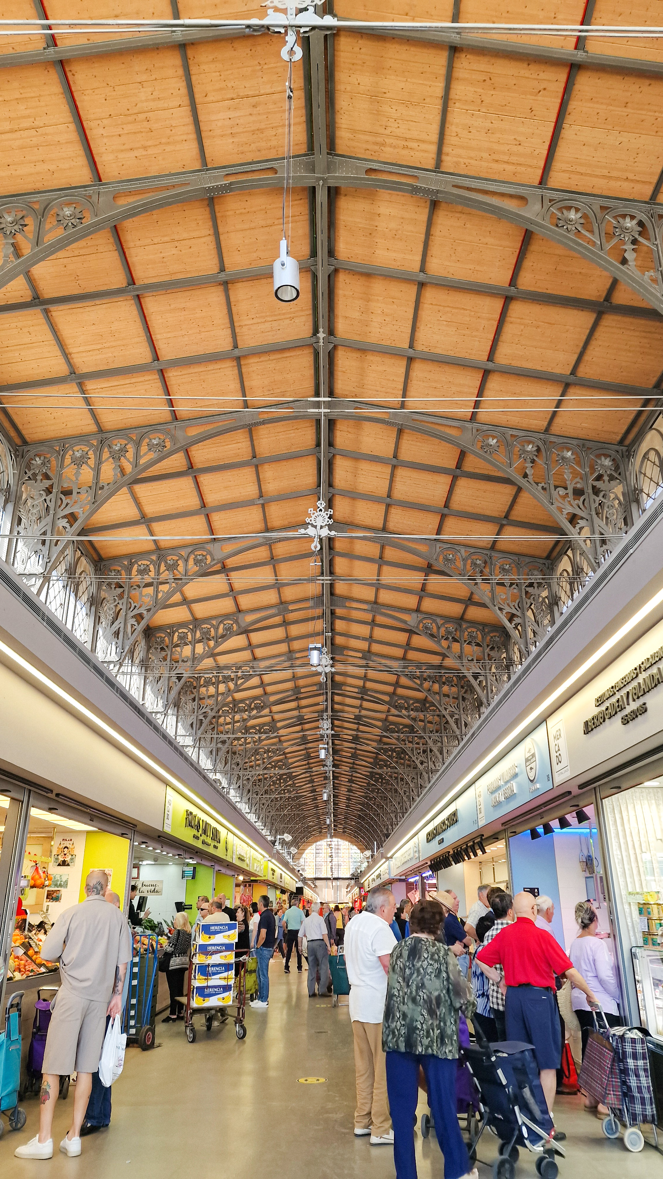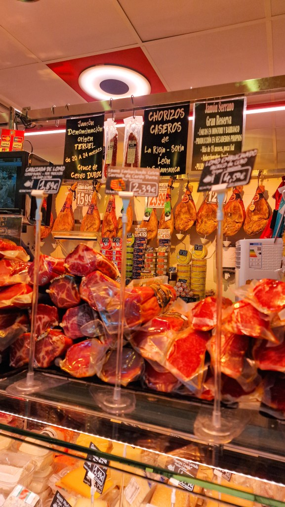 On prend plaisir à flâner dans ses allées, où les couleurs des fruits et légumes se mêlent aux odeurs de charcuteries, pâtisseries et fromages ibériques.